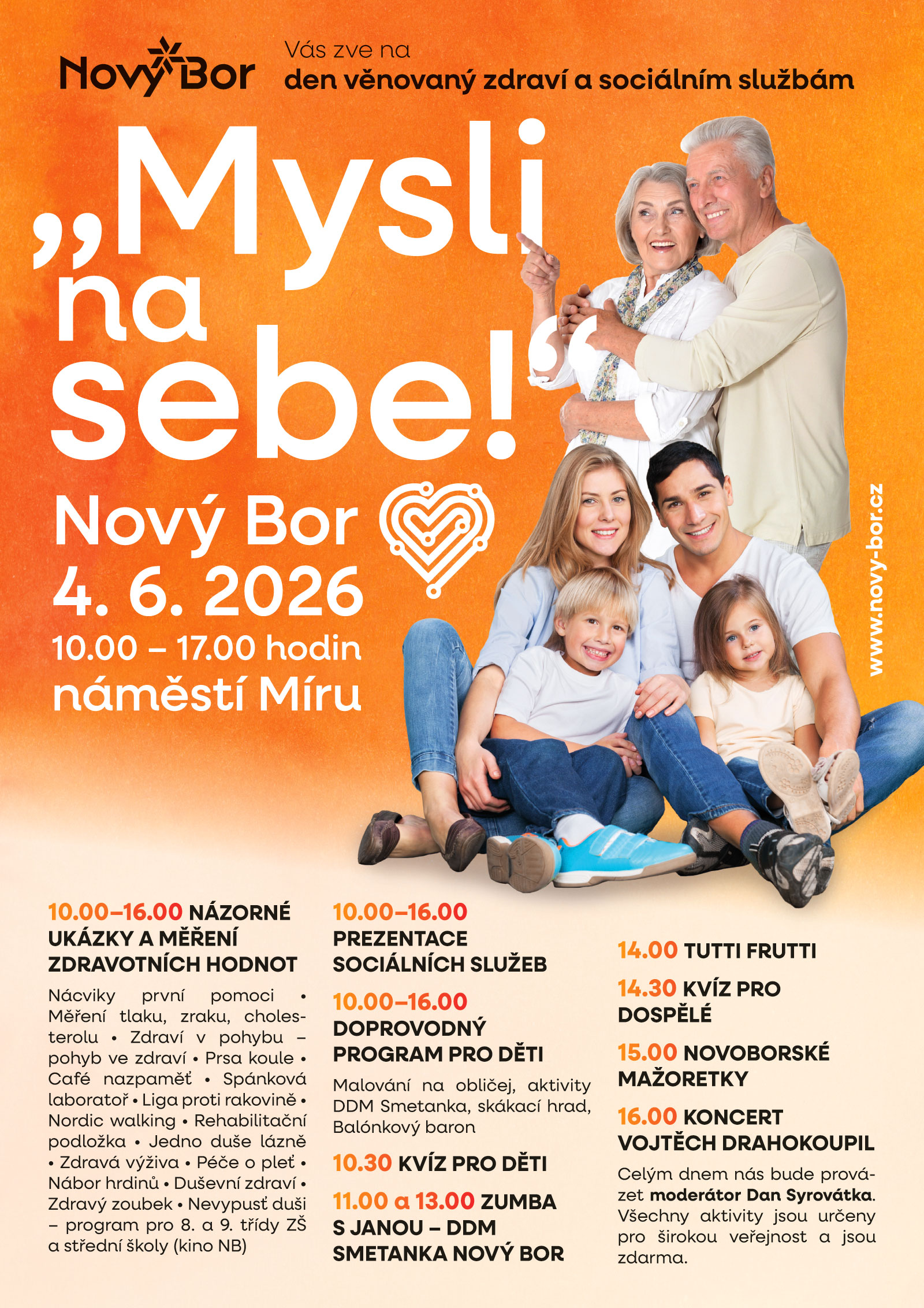 Město Nový Bor připravuje na čtvrtek 4. června 2026 akci zaměřenou na podporu zdraví a sociálních služeb na Novoborsku. Přijďte na náměstí Míru od 10 do 17 hodin. Připravena je nabídka zdravotně preventivních aktivit a informace od zástupců poskytovatelů sociálních služeb. Můžete se těšit také na kulturní program pro děti i dospělé.
